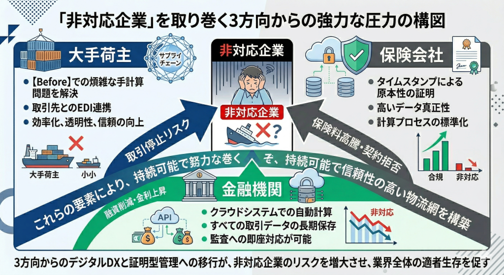 大手荷主は非対応企業との取引を見直し、金融機関はリスク評価を厳格化し、保険会社でも料金差の拡大が進んでいます。