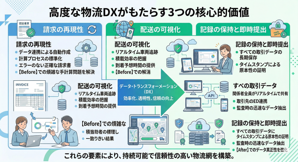 これにより、配送の流れや待機時間、作業実態が第三者でも確認可能になります。