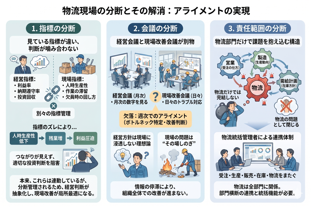 - 物流改革が進まない根本原因のひとつは、経営と現場の「指標・会議・責任範囲」の3層における分断にある