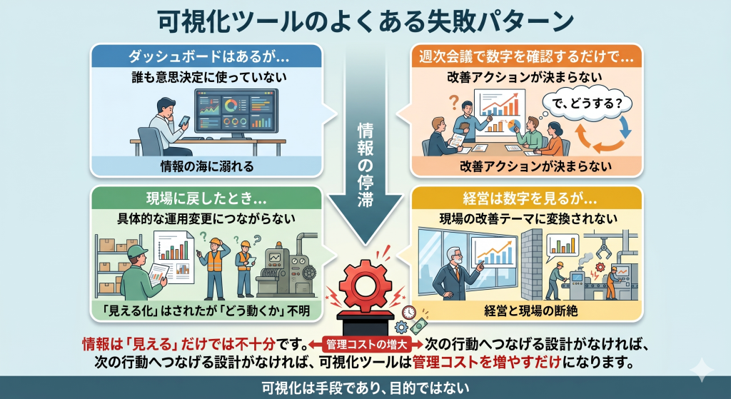 情報は「見える」だけでは不十分です。次の行動へつなげる設計がなければ、可視化ツールは管理コストを増やすだけになります。