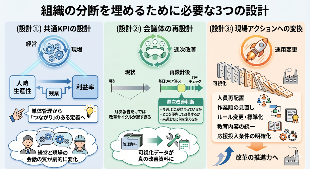 - ダッシュボードを作るだけでは不十分。「共通KPI設計・会議体再設計・現場アクション変換」の3つが必要