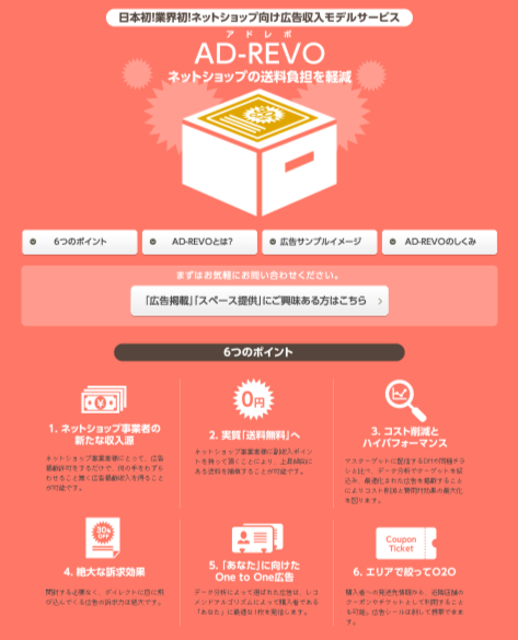 『AD-REVO』は、ネットショップ事業者が商品を発送する「箱」を「広告用スペース」として提供することで、広告代として収入を得られる広告収入モデルです。商品購入者情報や商品情報などの基礎データを分析し、最適な広告シール等を貼付けて送付できるため、広告主にも大きなメリットの提供が可能です。張付けた広告は、WEBへの誘導を促すツールや、剥してクーポンやチケットとして使用していただけます。
