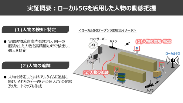 これらを踏まえ、本取り組みでは、物流業務の見える化によるスマート物流の実現に向け、ローカル5GとAI画像分析技術を活用した人の動態把握ソリューションに関する検証を行いました。