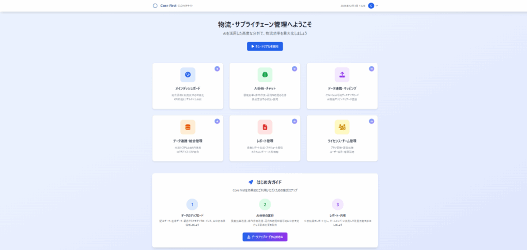 Core Firstは、物流に関わるすべてのデータ(人・モノ・機械・環境)を数値化し、蓄積・集約するためのデータプラットフォームです。メーカーや機種を問わず既存システム・機器をそのまま接続でき、システムの入れ替えは不要です。いつどこからでも、経営・管理・現場が同じデータをリアルタイムに共有でき、データドリブンな経営判断と現場改善を実現します。