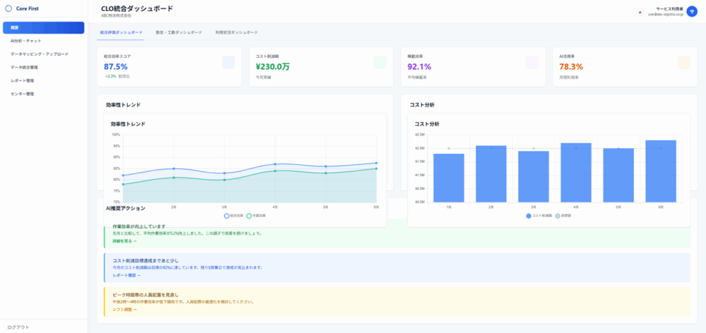 総合効率・コスト削減・積載効率・AI活用度など主要KPIを可視化し、意思決定を支援